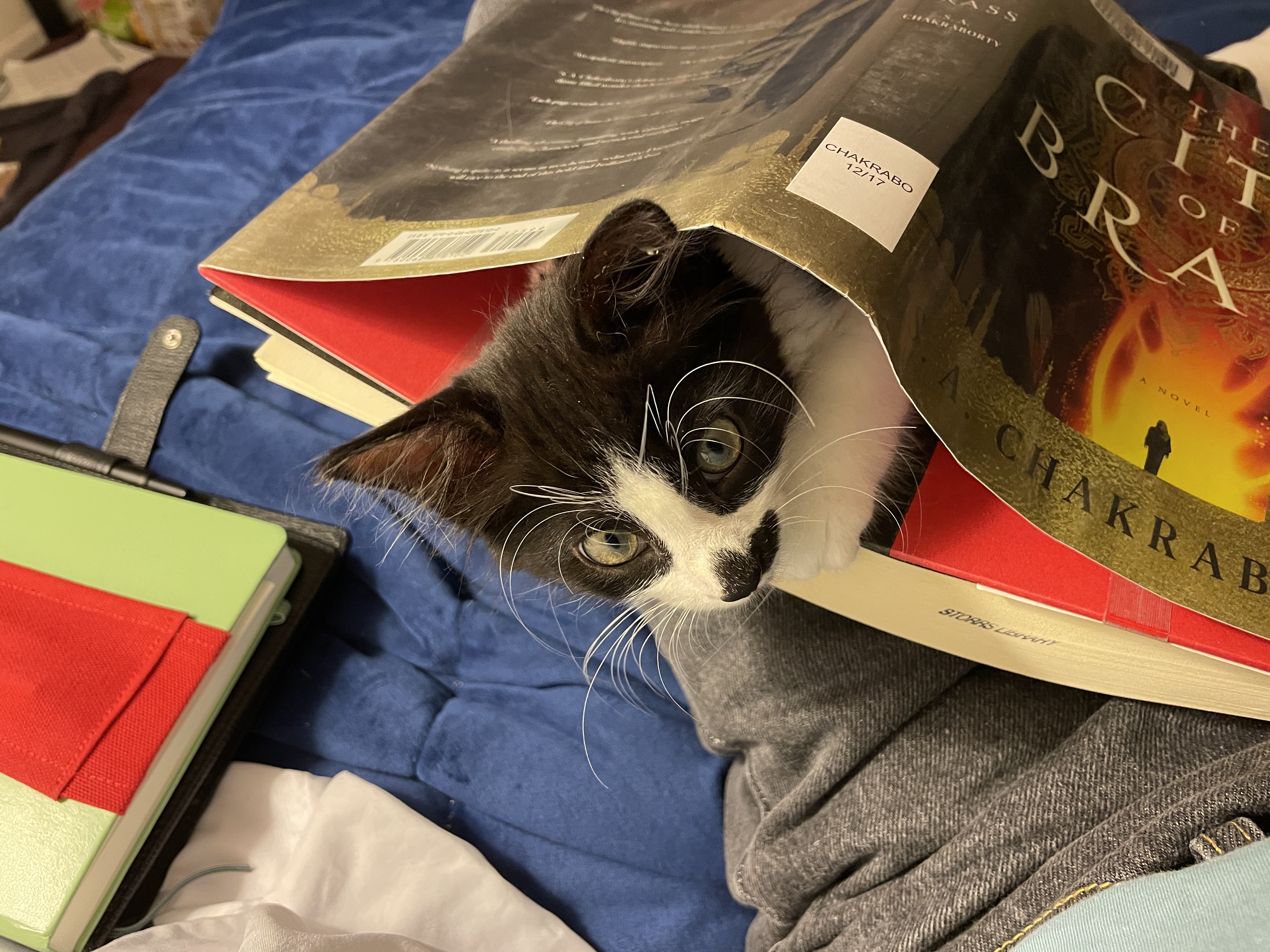 In August, I went through three fantasy novels, then read a bunch of short stories, and ended the month enjoying the first few novellas of a highly-regarded sci-fi series. This month’s reading companion is Cranberry, who’s now available for adoption if you’re in the Springfield, MA area.